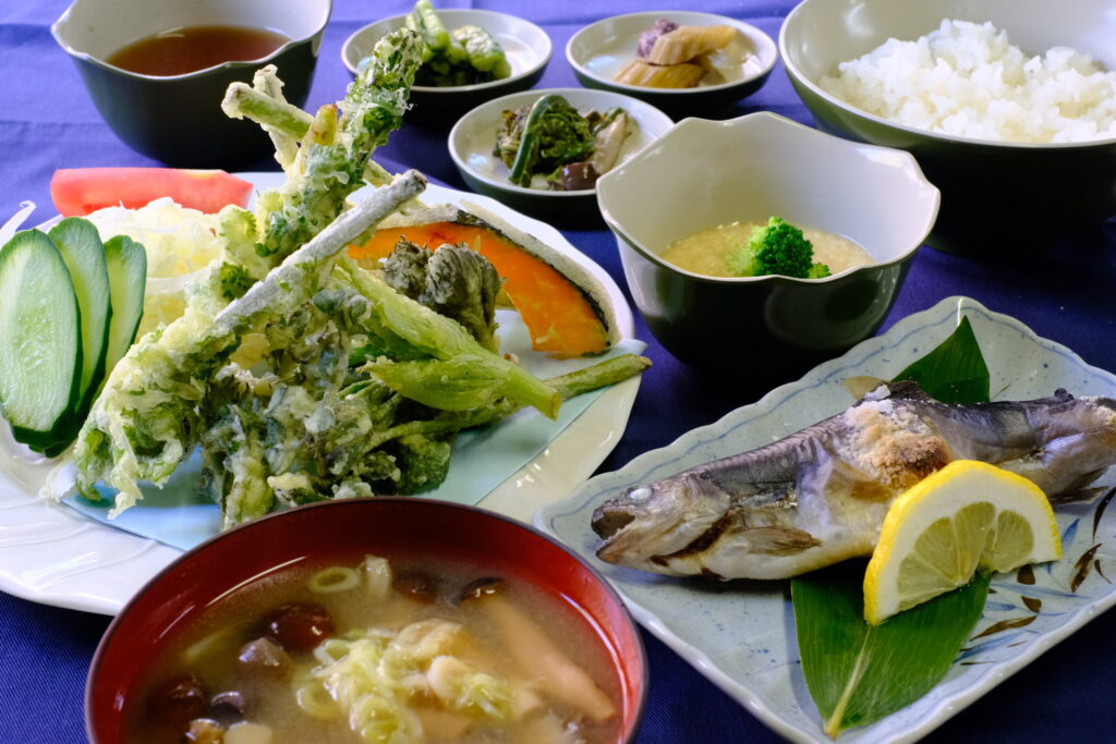 夕食は地元産の山菜天ぷらや岩魚の塩焼きなど、山歩きで疲れた体をお腹一杯にしてもらえるように料理をお出しています。
